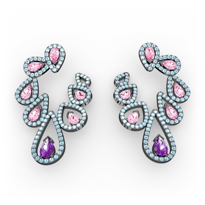 Ametist, pembe kuvars ve akuamarin 925 ayar siyah rodyum kaplama gümüş küpe