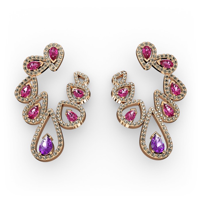 Ametist, rodolit garnet ve dumanlı kuvars 18 ayar rose altın küpe