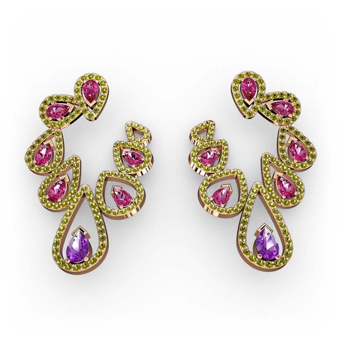 Ametist, rodolit garnet ve peridot 8 ayar rose altın küpe