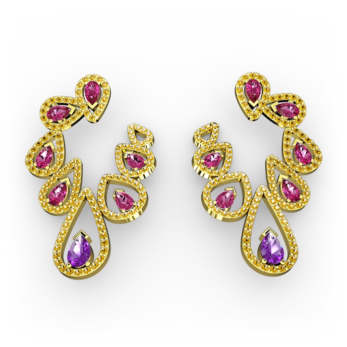 Ametist, rodolit garnet ve sitrin 925 ayar altın kaplama gümüş küpe