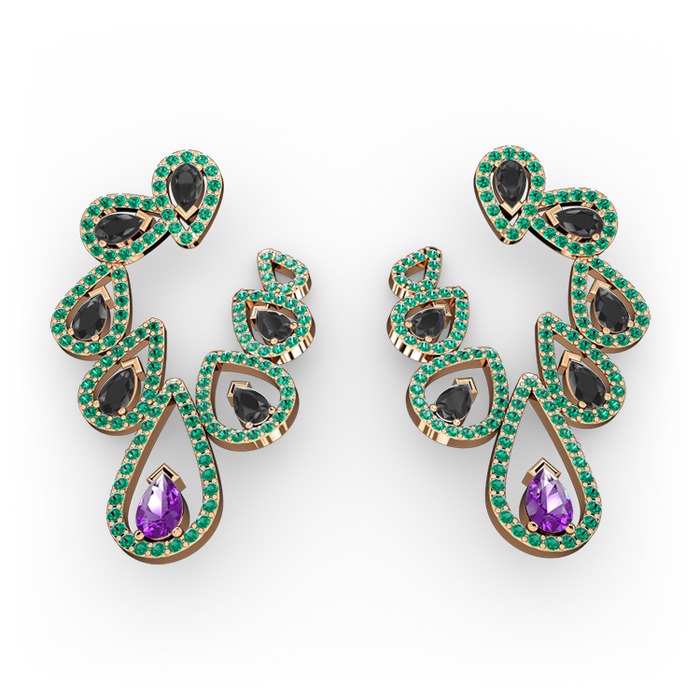 Ametist, siyah zirkon ve yeşil kuvars 14 ayar rose altın küpe