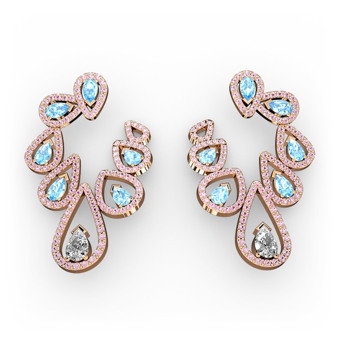 Beyaz zirkon, akuamarin ve pembe kuvars 925 ayar rose altın kaplama gümüş küpe