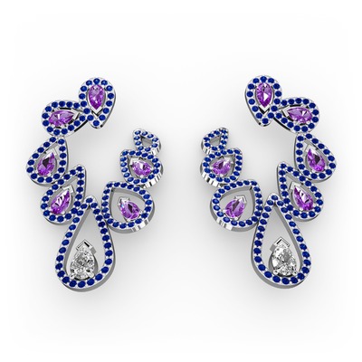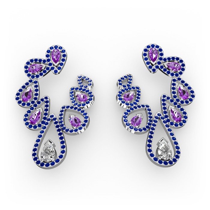 Beyaz zirkon, ametist ve lab safir 18 ayar beyaz altın küpe
