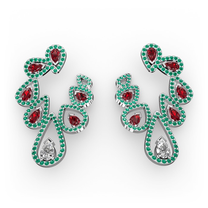 Beyaz zirkon, garnet ve yeşil kuvars 14 ayar beyaz altın küpe