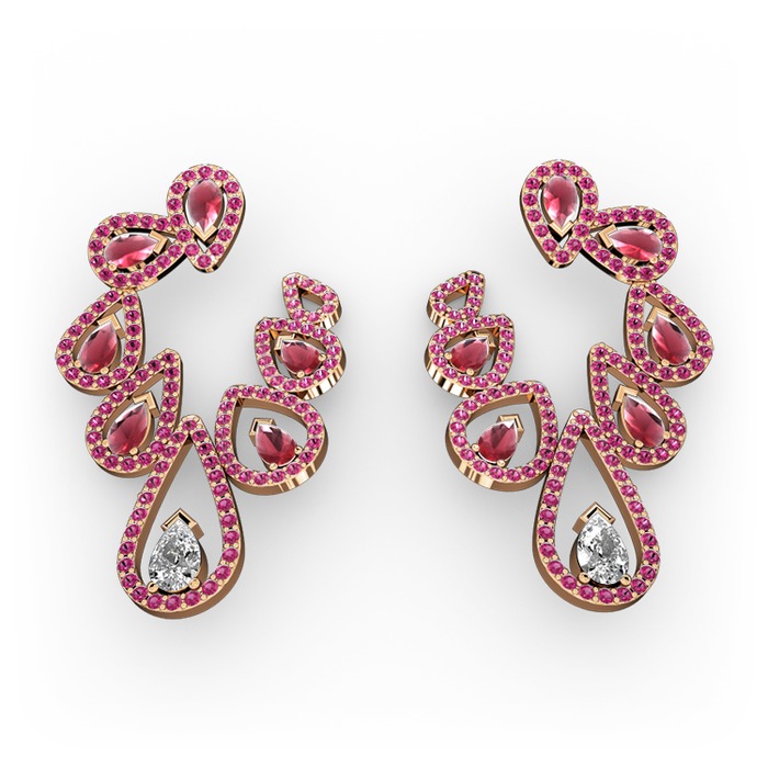Beyaz zirkon, kök yakut ve rodolit garnet 14 ayar rose altın küpe
