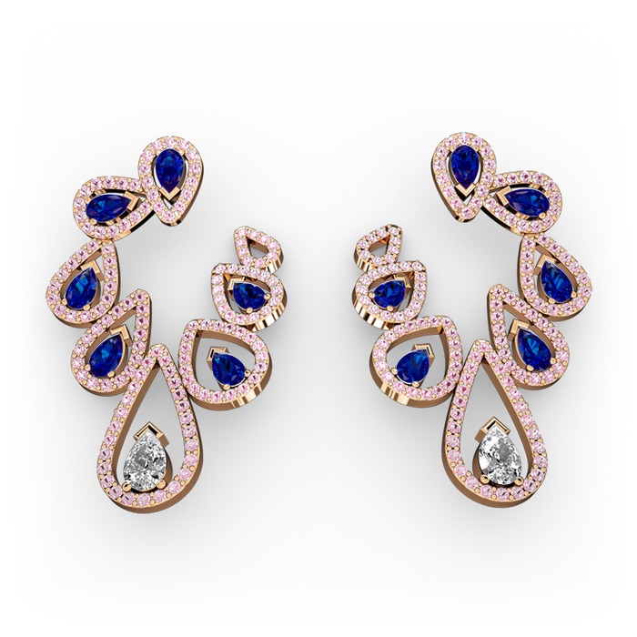 Beyaz zirkon, lab safir ve pembe kuvars 18 ayar rose altın küpe