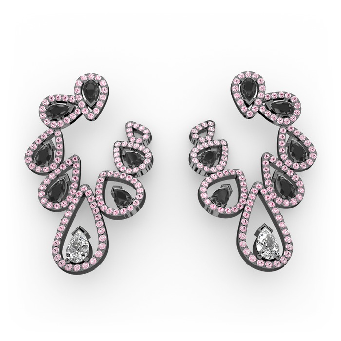 Beyaz zirkon, siyah zirkon ve pembe kuvars 925 ayar siyah rodyum kaplama gümüş küpe