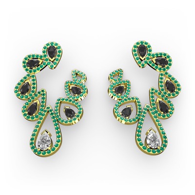 Beyaz zirkon, siyah zirkon ve yeşil kuvars 925 ayar altın kaplama gümüş küpe