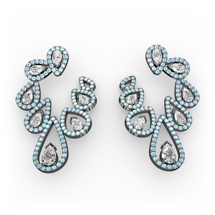 Beyaz zirkon, swarovski ve akuamarin 925 ayar siyah rodyum kaplama gümüş küpe