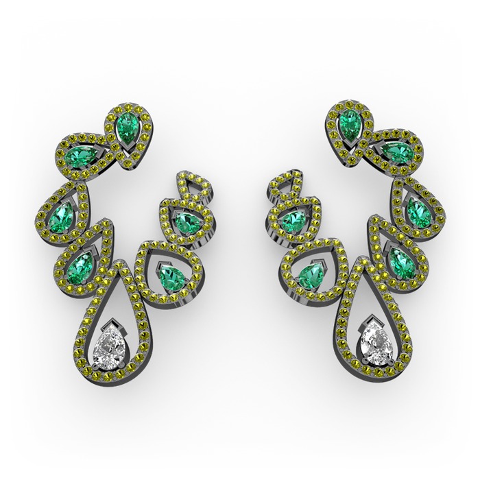 Beyaz zirkon, yeşil kuvars ve peridot 925 ayar siyah rodyum kaplama gümüş küpe