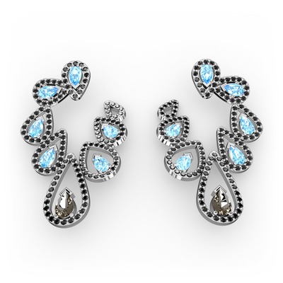 Dumanlı kuvars, akuamarin ve siyah zirkon 18 ayar beyaz altın küpe