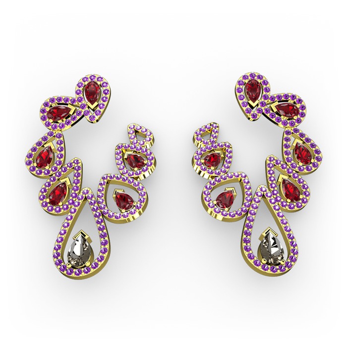 Dumanlı kuvars, garnet ve ametist 18 ayar altın küpe