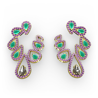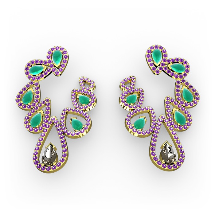 Dumanlı kuvars, kök zümrüt ve ametist 14 ayar altın küpe