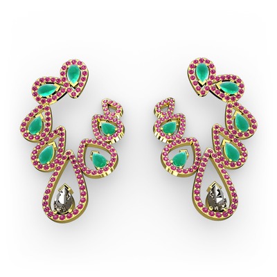 Dumanlı kuvars, kök zümrüt ve rodolit garnet 925 ayar altın kaplama gümüş küpe