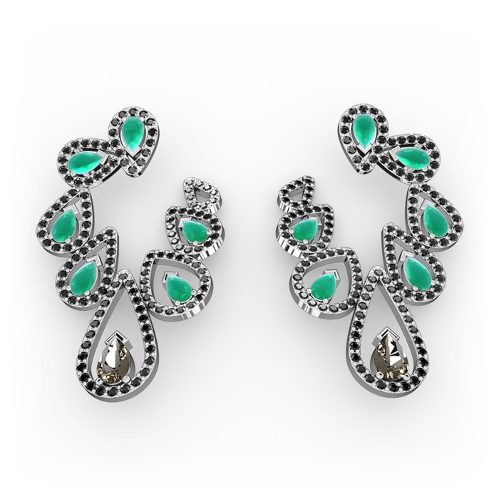 Dumanlı kuvars, kök zümrüt ve siyah zirkon 18 ayar beyaz altın küpe