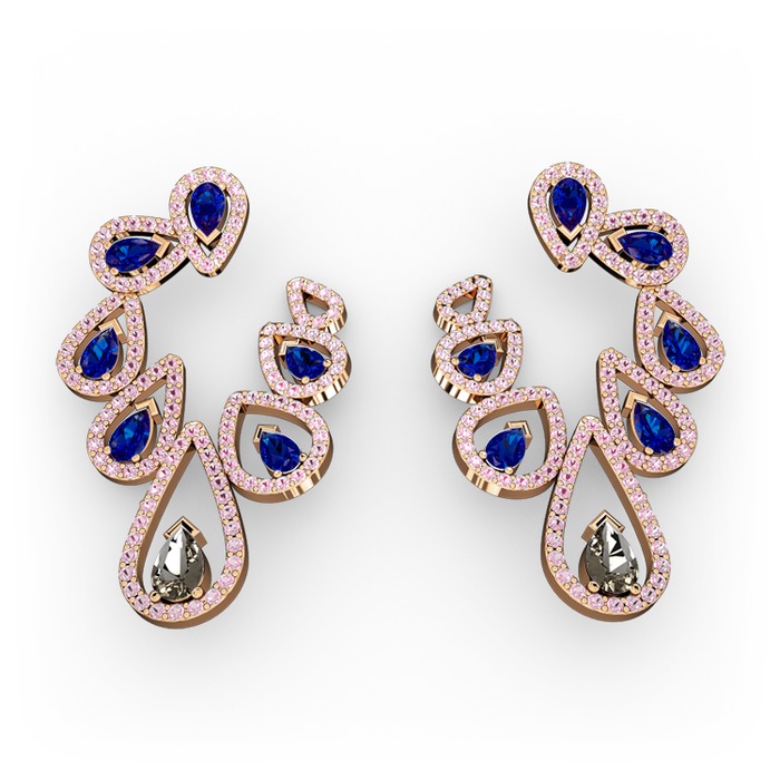 Dumanlı kuvars, lab safir ve pembe kuvars 14 ayar rose altın küpe