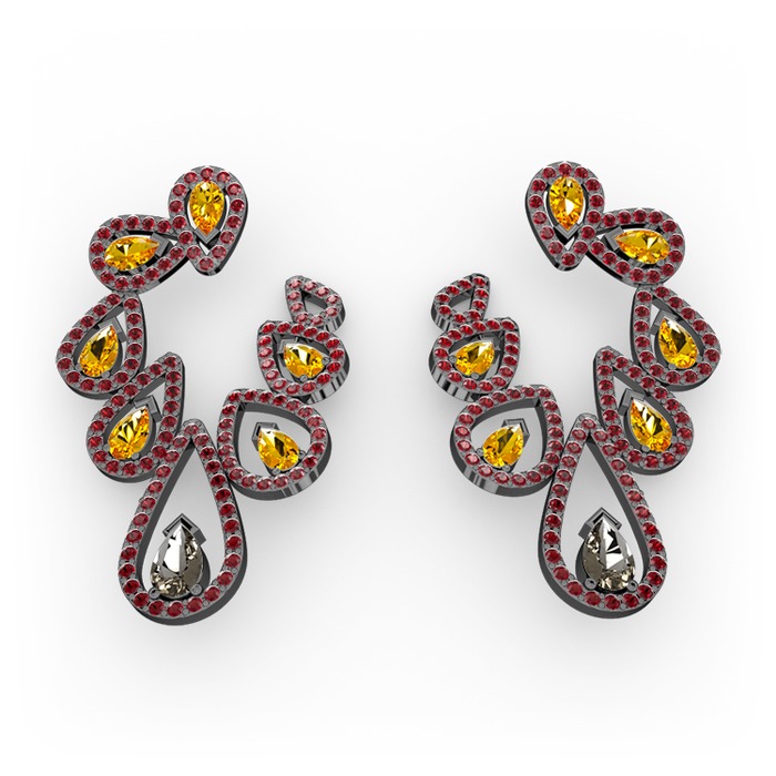 Dumanlı kuvars, sitrin ve garnet 925 ayar siyah rodyum kaplama gümüş küpe