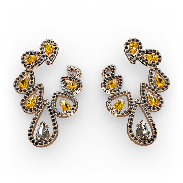 Dumanlı kuvars, sitrin ve siyah zirkon 18 ayar rose altın küpe