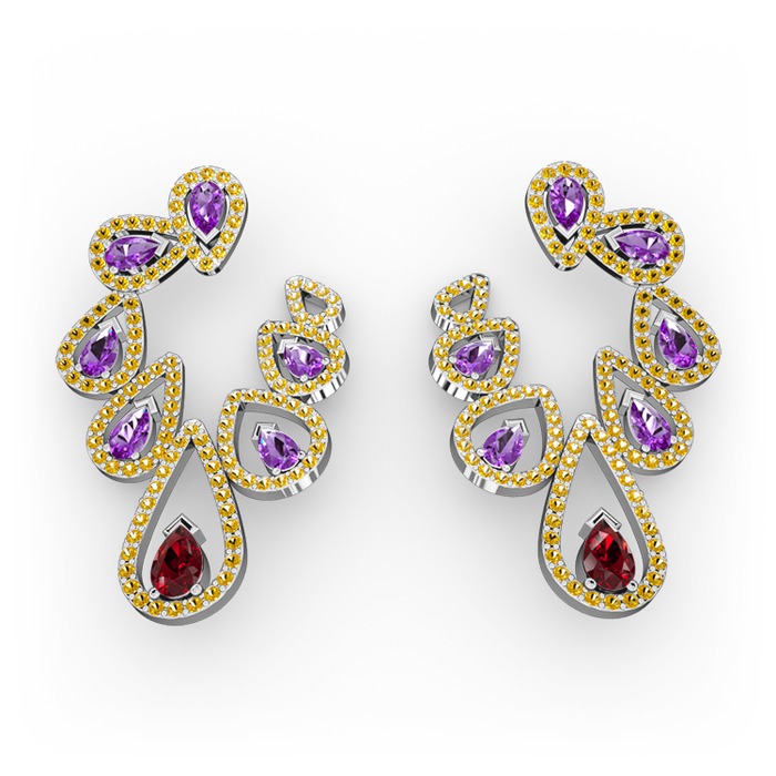 Garnet, ametist ve sitrin 8 ayar beyaz altın küpe