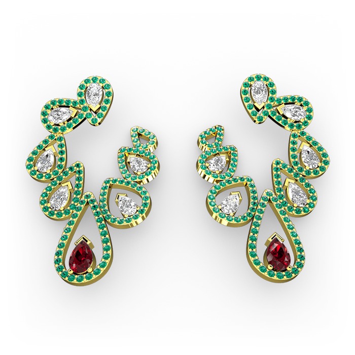 Garnet, beyaz zirkon ve yeşil kuvars 14 ayar altın küpe