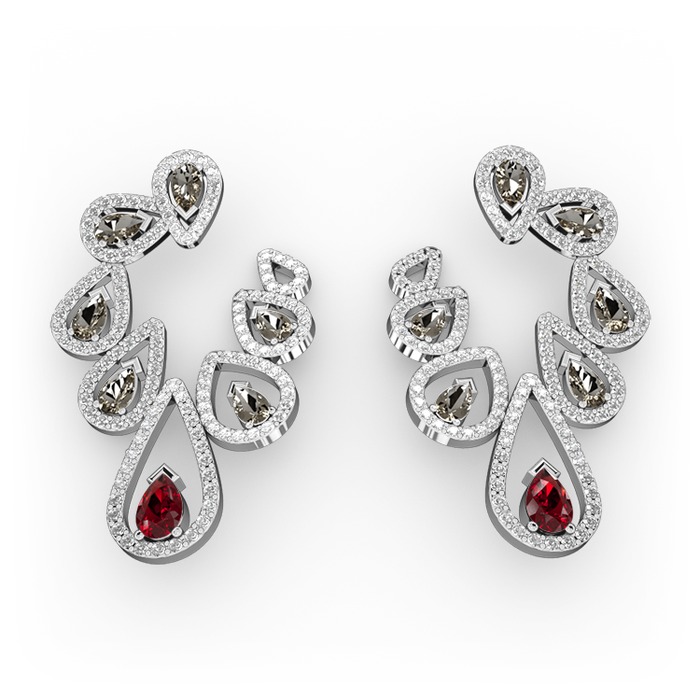 Garnet, dumanlı kuvars ve beyaz zirkon 14 ayar beyaz altın küpe