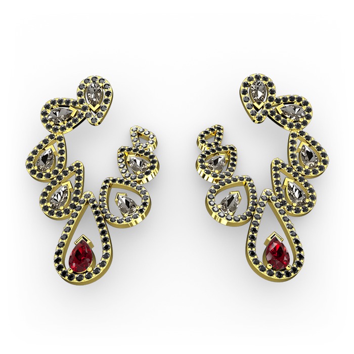 Garnet, dumanlı kuvars ve siyah zirkon 18 ayar altın küpe