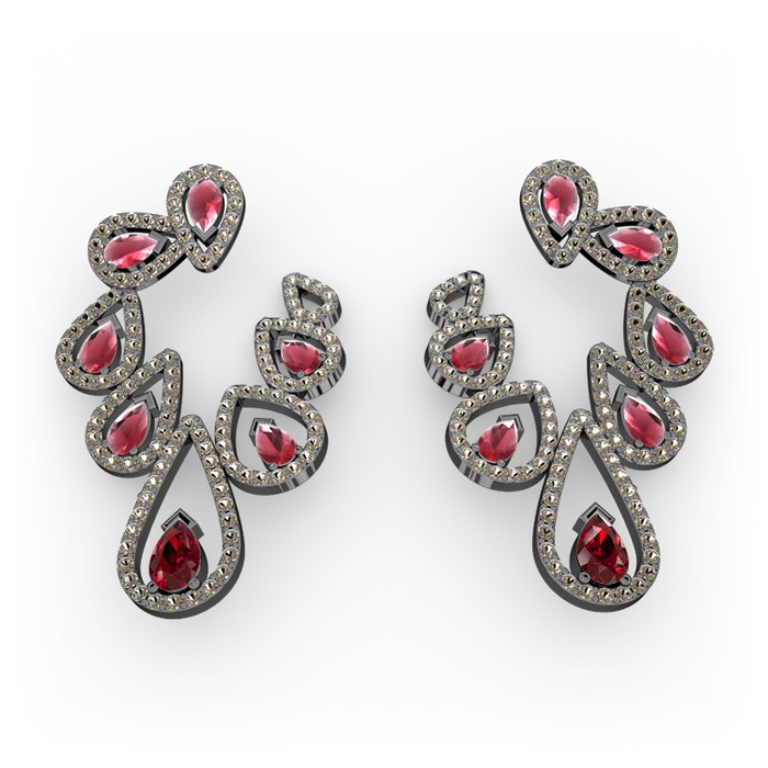 Garnet, kök yakut ve dumanlı kuvars 925 ayar siyah rodyum kaplama gümüş küpe