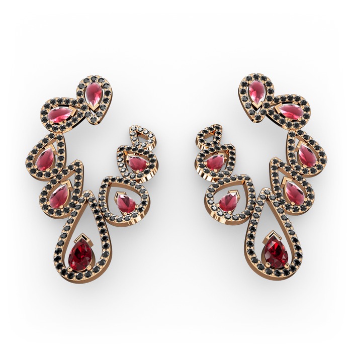 Garnet, kök yakut ve siyah zirkon 14 ayar rose altın küpe