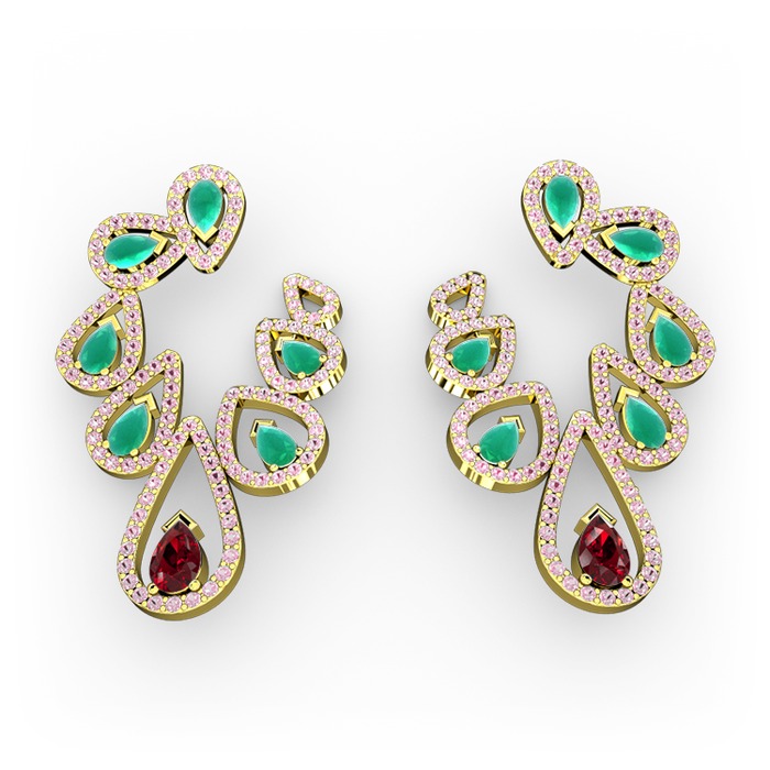 Garnet, kök zümrüt ve pembe kuvars 8 ayar altın küpe