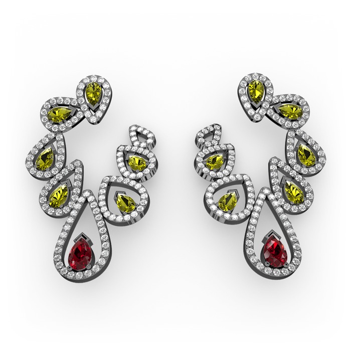 Garnet, peridot ve beyaz zirkon 925 ayar siyah rodyum kaplama gümüş küpe