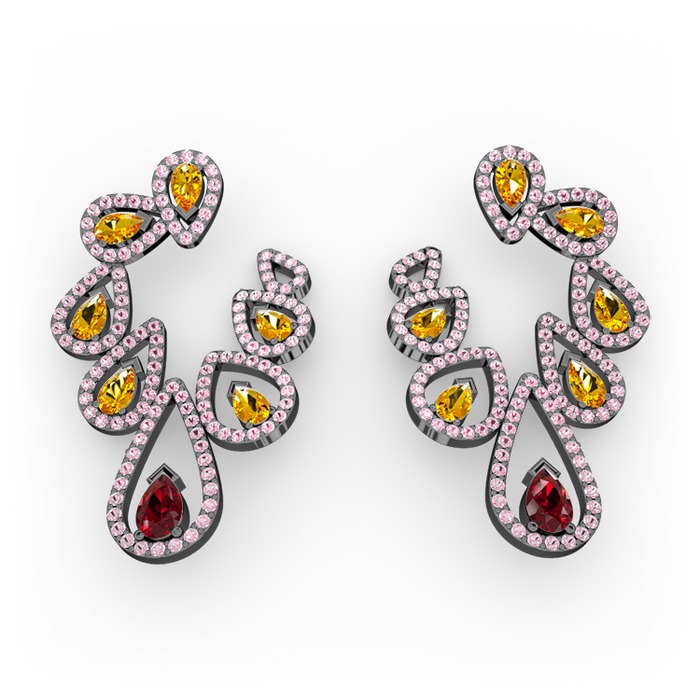 Garnet, sitrin ve pembe kuvars 925 ayar siyah rodyum kaplama gümüş küpe