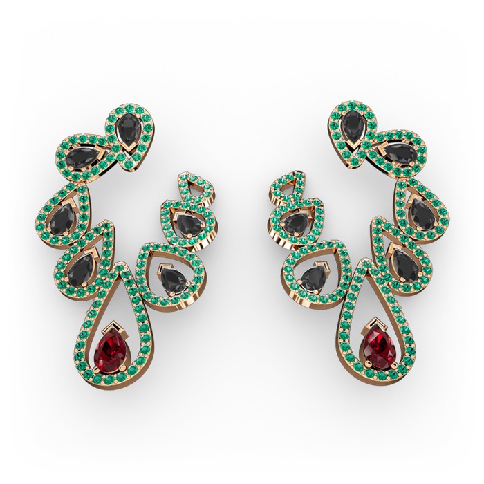 Garnet, siyah zirkon ve yeşil kuvars 18 ayar rose altın küpe
