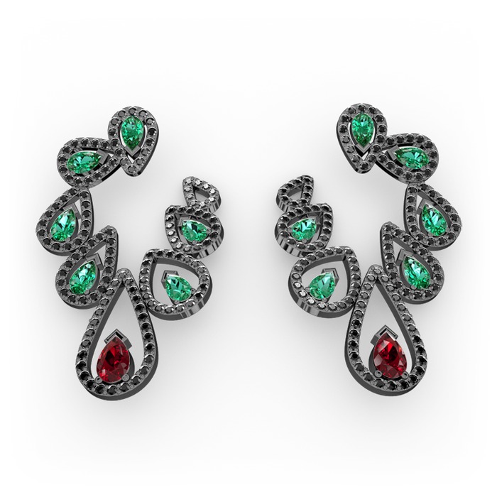 Garnet, yeşil kuvars ve siyah zirkon 925 ayar siyah rodyum kaplama gümüş küpe