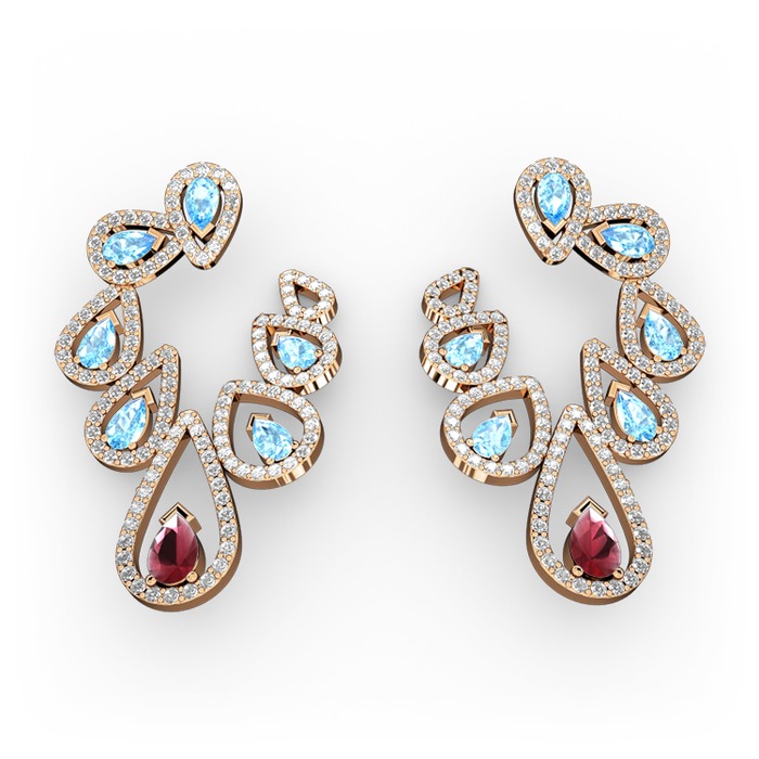 Kök yakut, akuamarin ve beyaz zirkon 925 ayar rose altın kaplama gümüş küpe