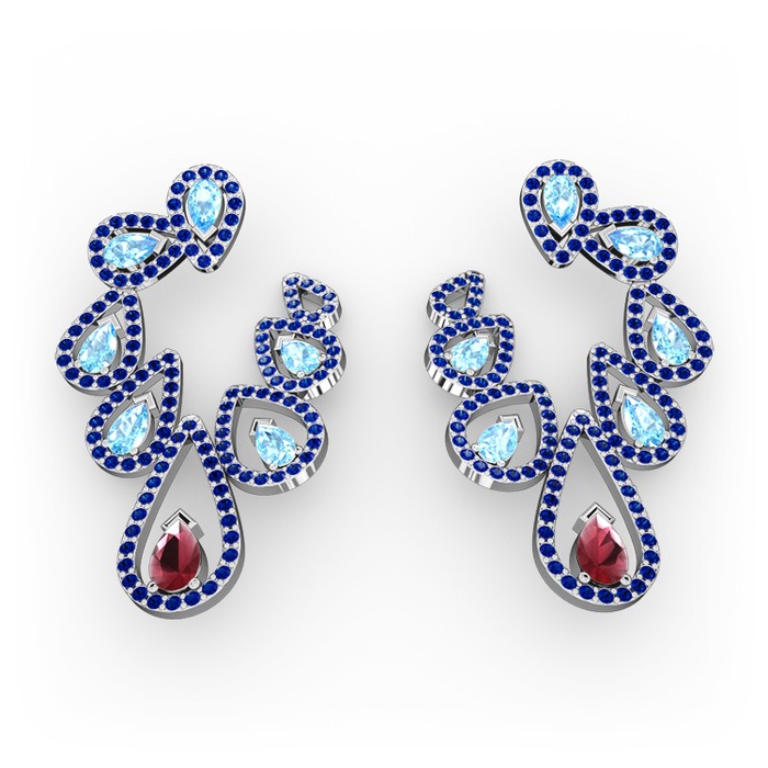 Kök yakut, akuamarin ve lab safir 18 ayar beyaz altın küpe