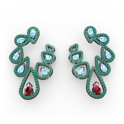 Kök yakut, akuamarin ve yeşil kuvars 925 ayar siyah rodyum kaplama gümüş küpe