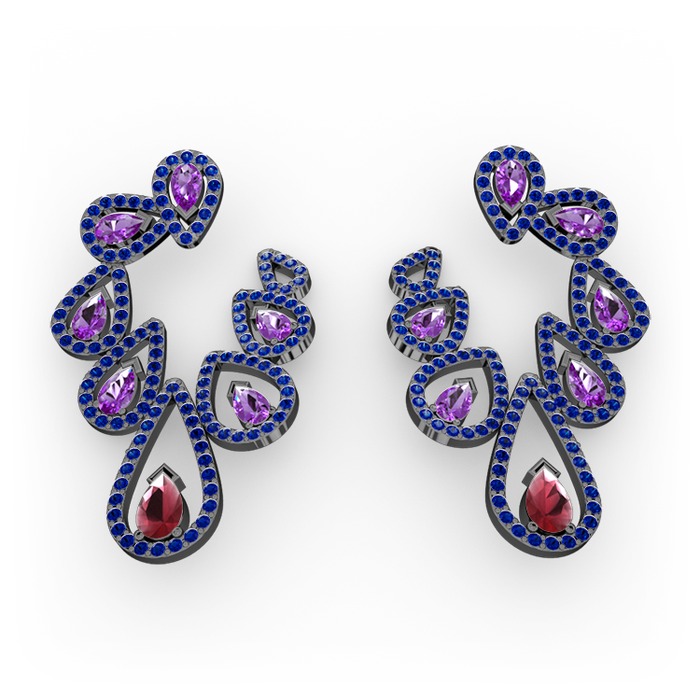 Kök yakut, ametist ve lab safir 925 ayar siyah rodyum kaplama gümüş küpe