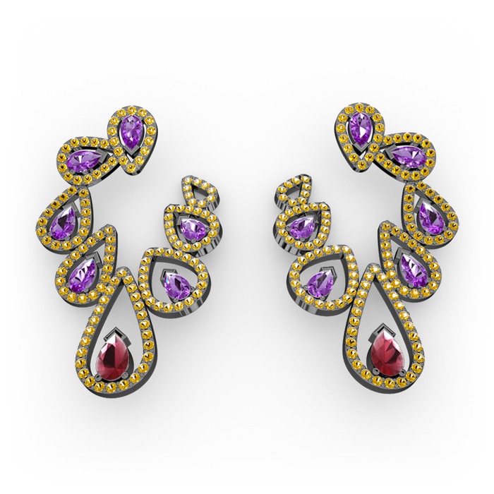 Kök yakut, ametist ve sitrin 925 ayar siyah rodyum kaplama gümüş küpe