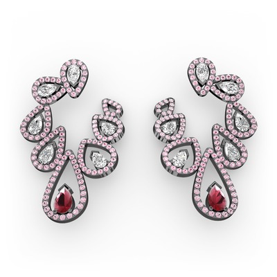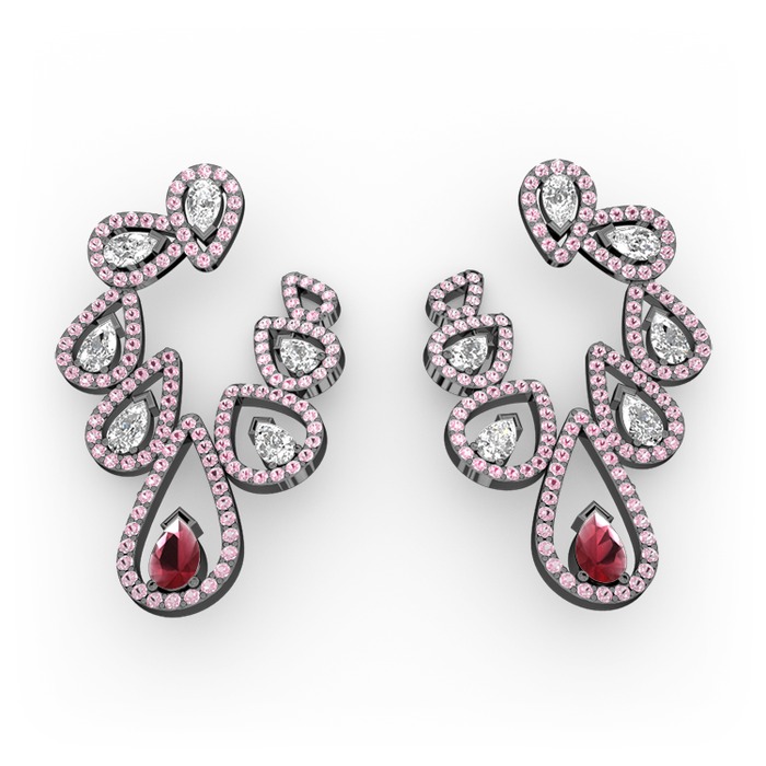 Kök yakut, beyaz zirkon ve pembe kuvars 925 ayar siyah rodyum kaplama gümüş küpe