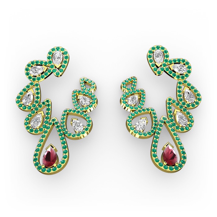 Kök yakut, beyaz zirkon ve yeşil kuvars 8 ayar altın küpe