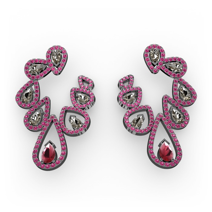 Kök yakut, dumanlı kuvars ve rodolit garnet 925 ayar siyah rodyum kaplama gümüş küpe