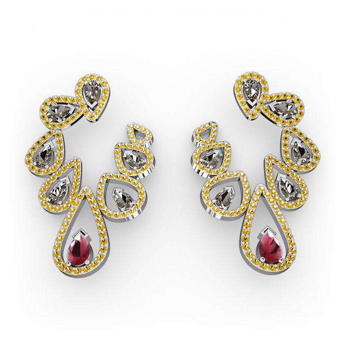 Kök yakut, dumanlı kuvars ve sitrin 8 ayar beyaz altın küpe