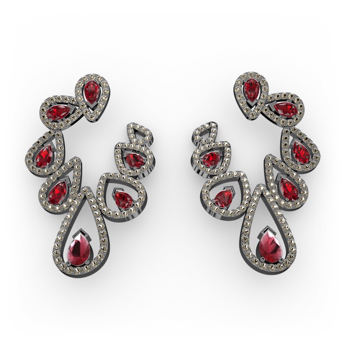 Kök yakut, garnet ve dumanlı kuvars 925 ayar siyah rodyum kaplama gümüş küpe