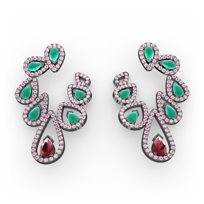 Kök yakut, kök zümrüt ve pembe kuvars 925 ayar siyah rodyum kaplama gümüş küpe