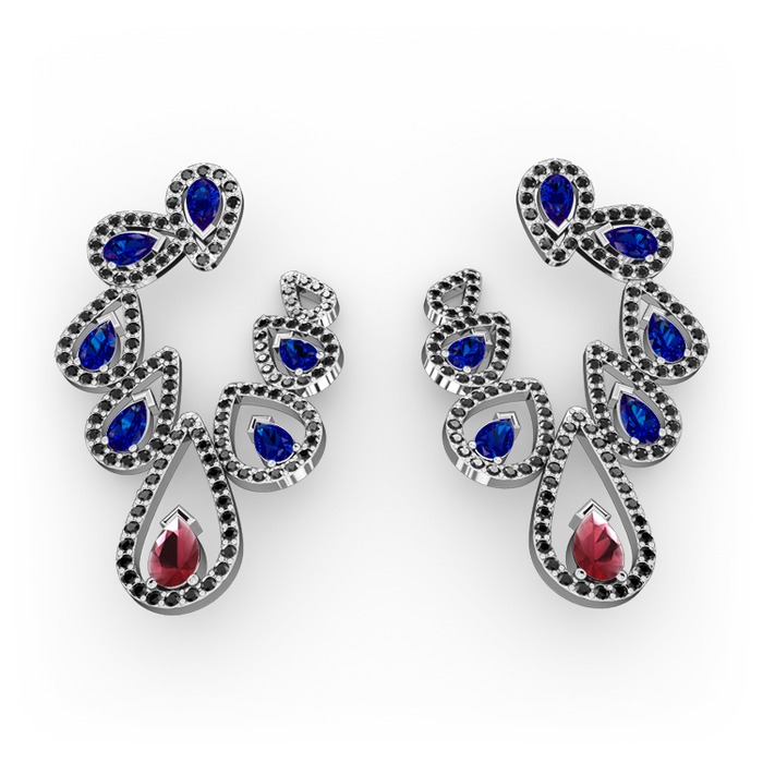 Kök yakut, lab safir ve siyah zirkon 8 ayar beyaz altın küpe