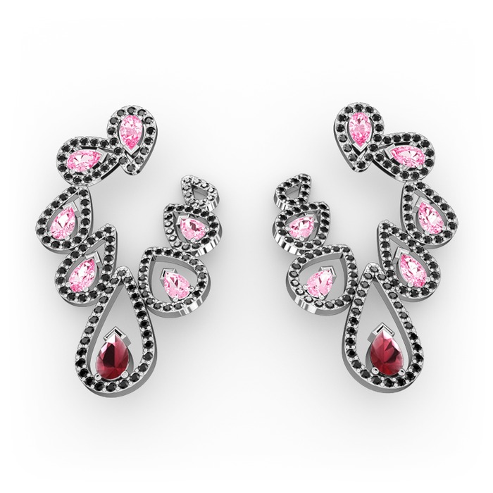 Kök yakut, pembe kuvars ve siyah zirkon 8 ayar beyaz altın küpe