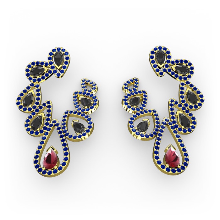 Kök yakut, siyah zirkon ve lab safir 8 ayar altın küpe