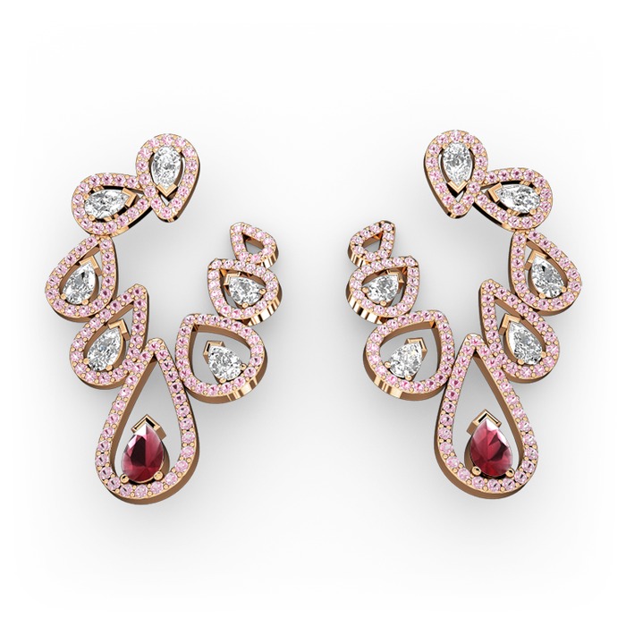Kök yakut, swarovski ve pembe kuvars 14 ayar rose altın küpe