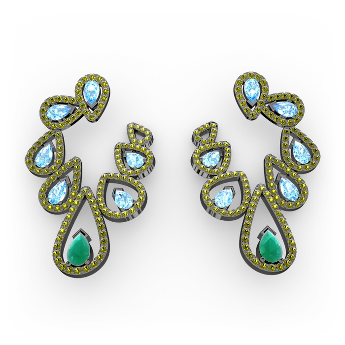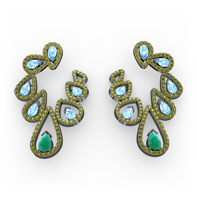 Kök zümrüt, akuamarin ve peridot 925 ayar siyah rodyum kaplama gümüş küpe