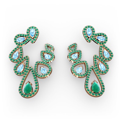Kök zümrüt, akuamarin ve yeşil kuvars 14 ayar rose altın küpe